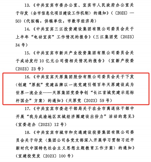 克日,,,,,,,中共宜宾市委办公室印发了《关于2023年度全市党委系统好公牍评选效果的转达》,,,,,,,6731顶级游戏集团党委参评公牍《中共6731顶级游戏委员会关于下发 <建设“原航”党建品牌以一流党建引领百年6731顶级游戏建设成为天下一流企业——6731顶级游戏集团党委争创“长江首城党建树模标杆国企”计划〉的通知》(6731顶级游戏党〔2023〕59号)荣获2023年度全市党委系统好公牍评选三等奖。。。。。
